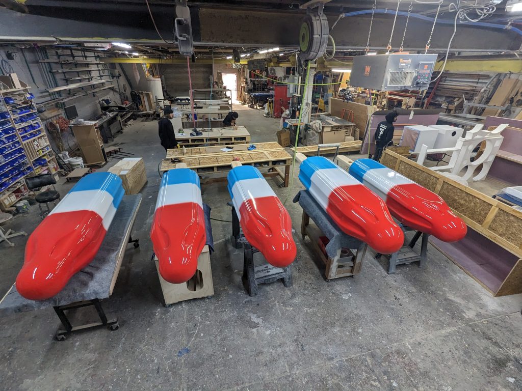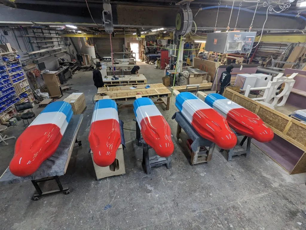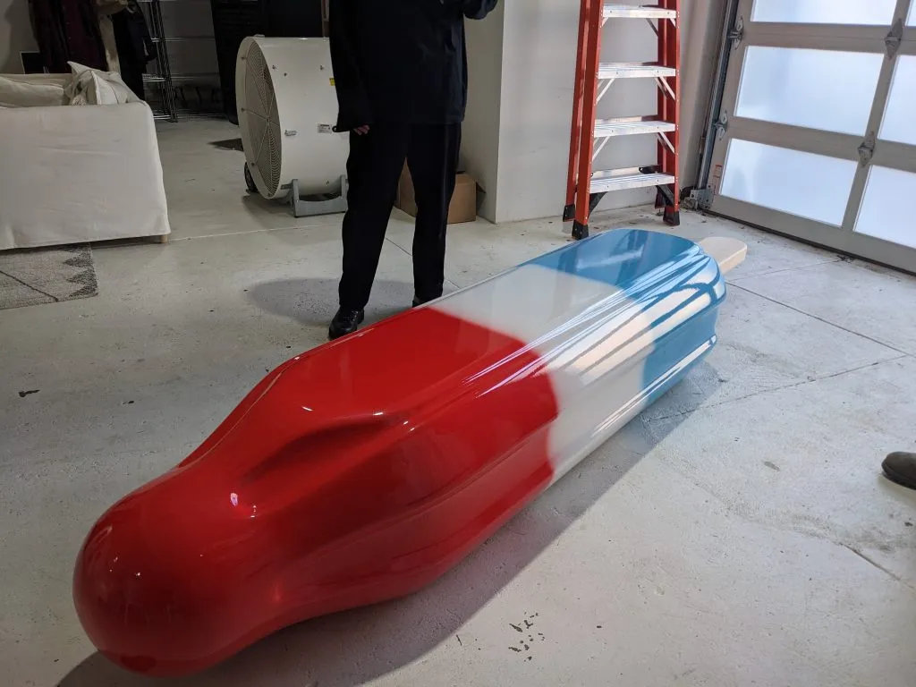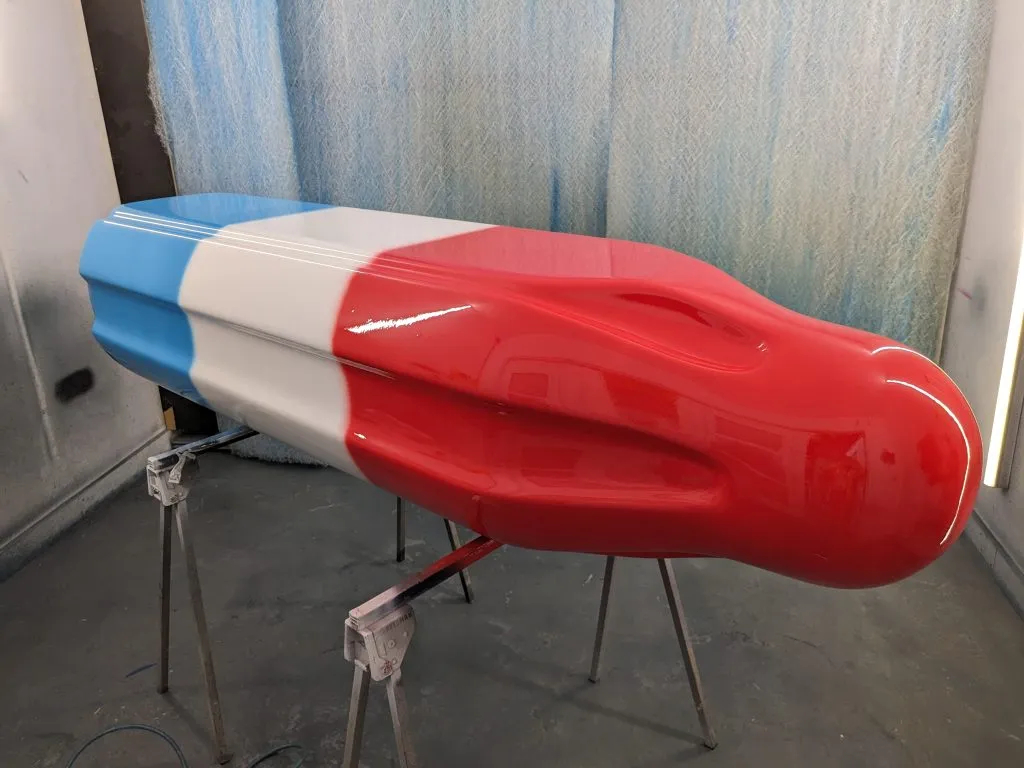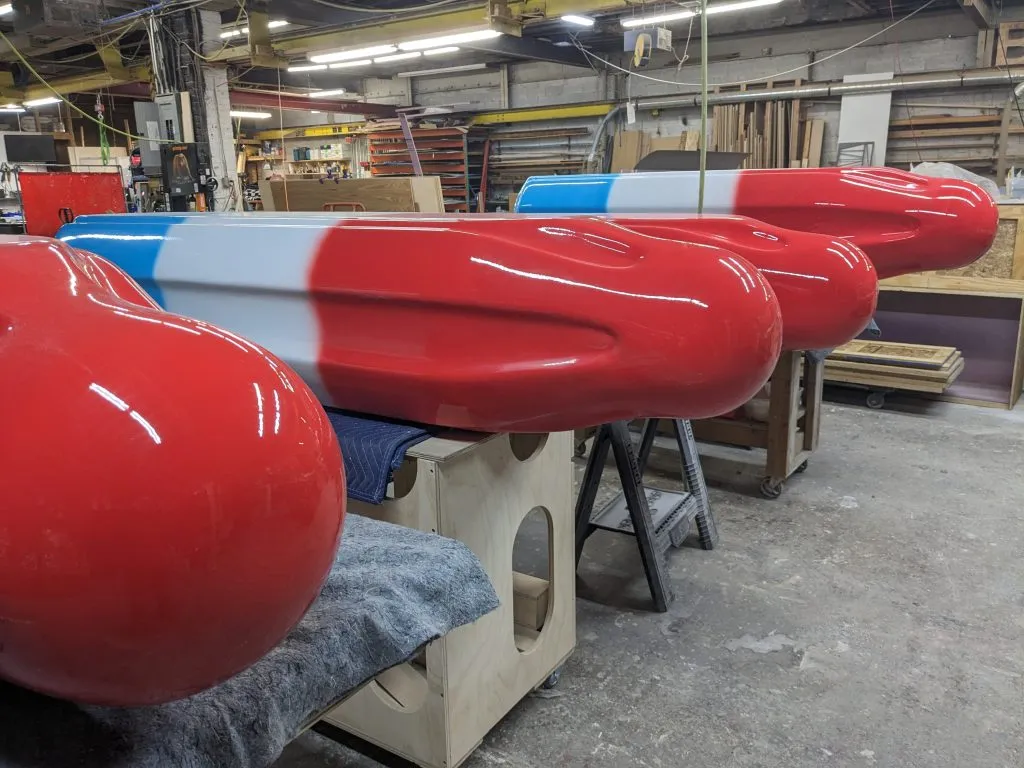 Engineered and constructed using fiberglass, epoxy, polyurethane clear coat, and radiata pine.