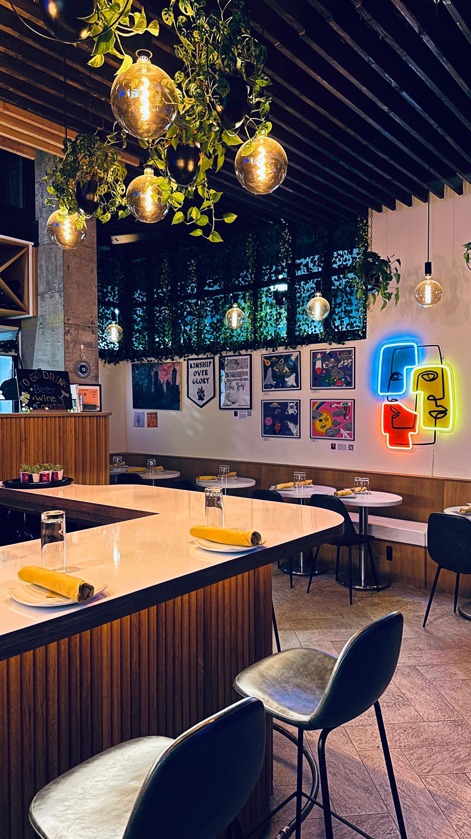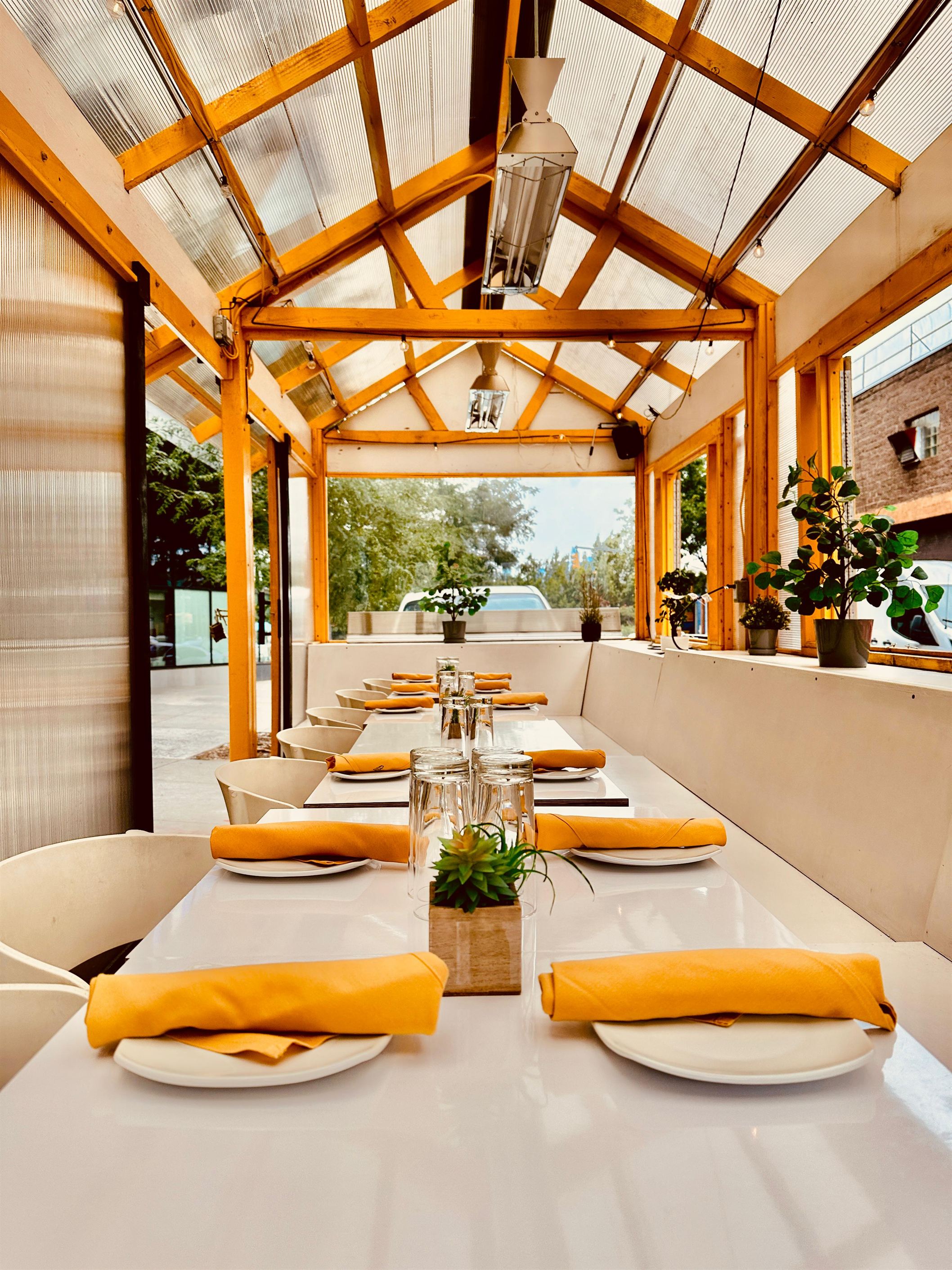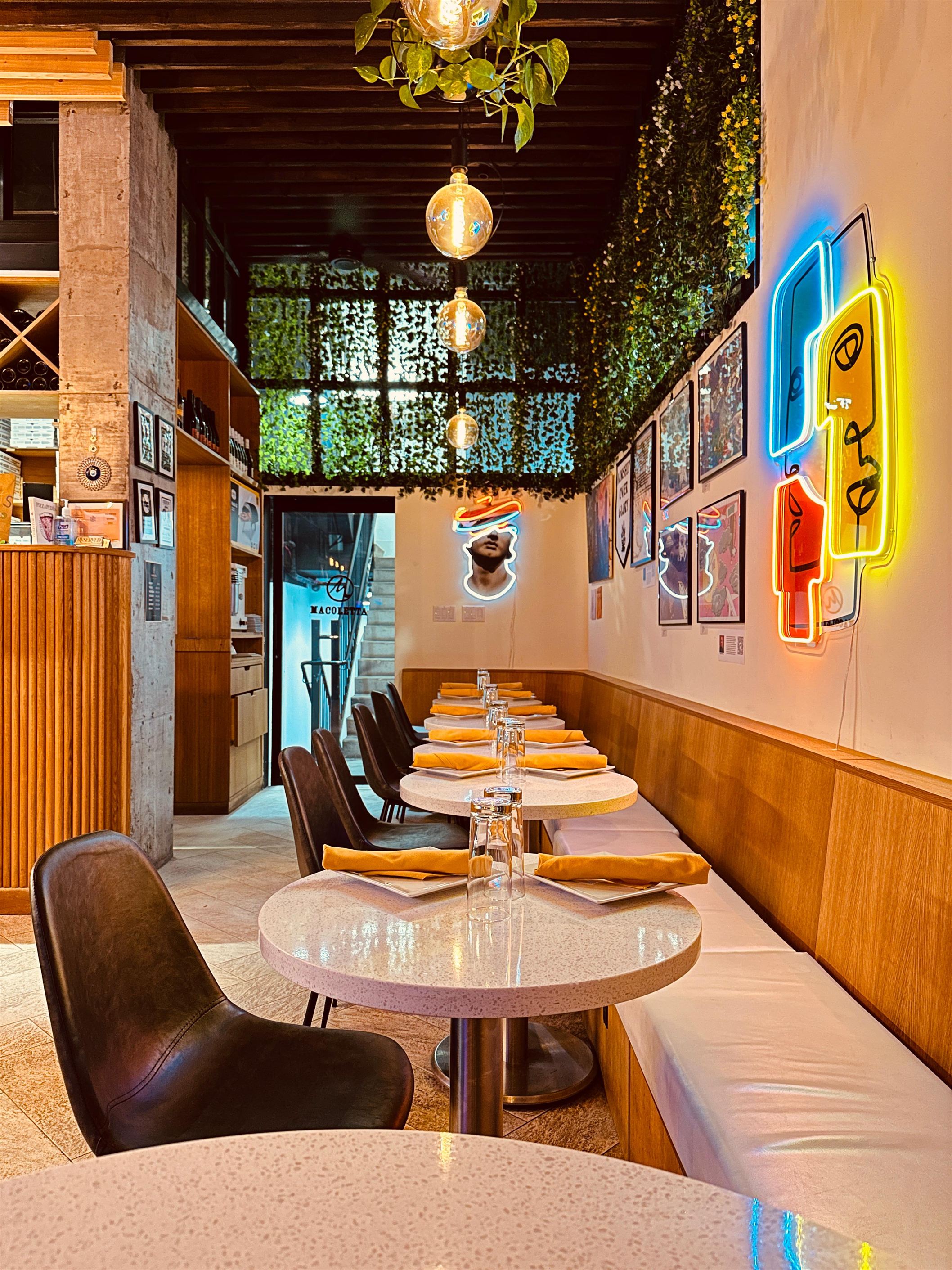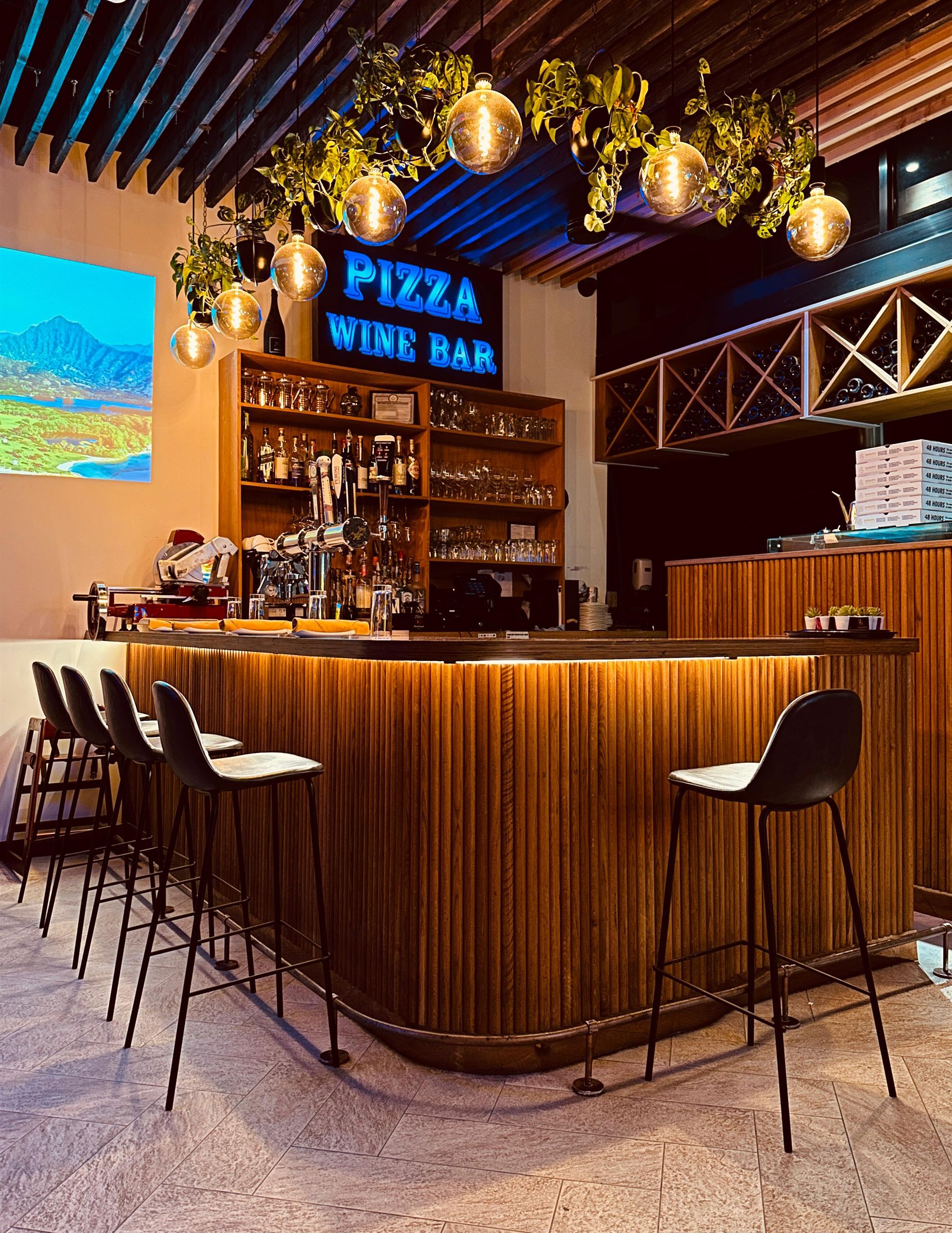 Macoletta’s Williamsburg location features a fluted bar crafted from solid oak half-rounds, a laminated top, and integrated lighting. Custom benches are made with white oak veneer.