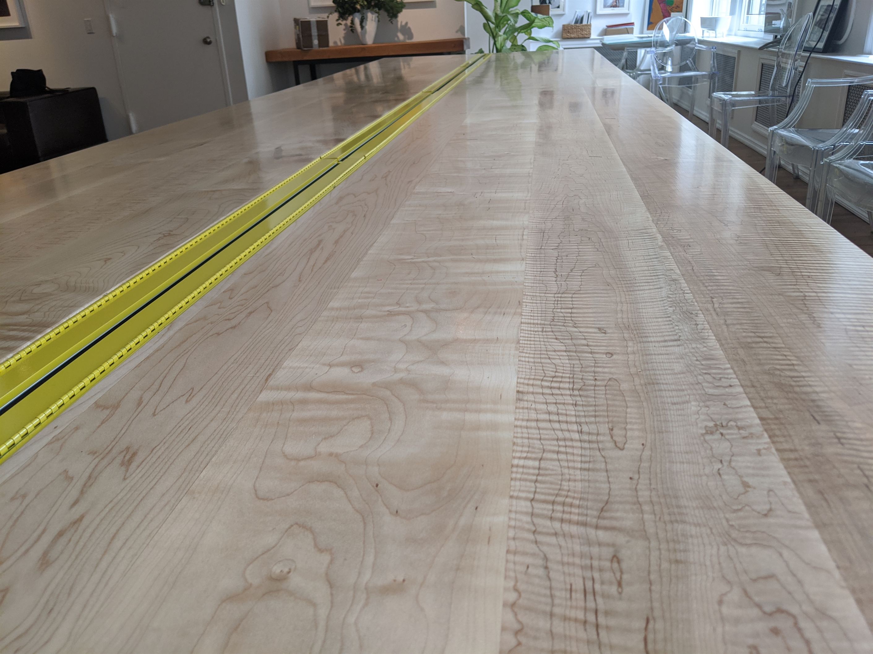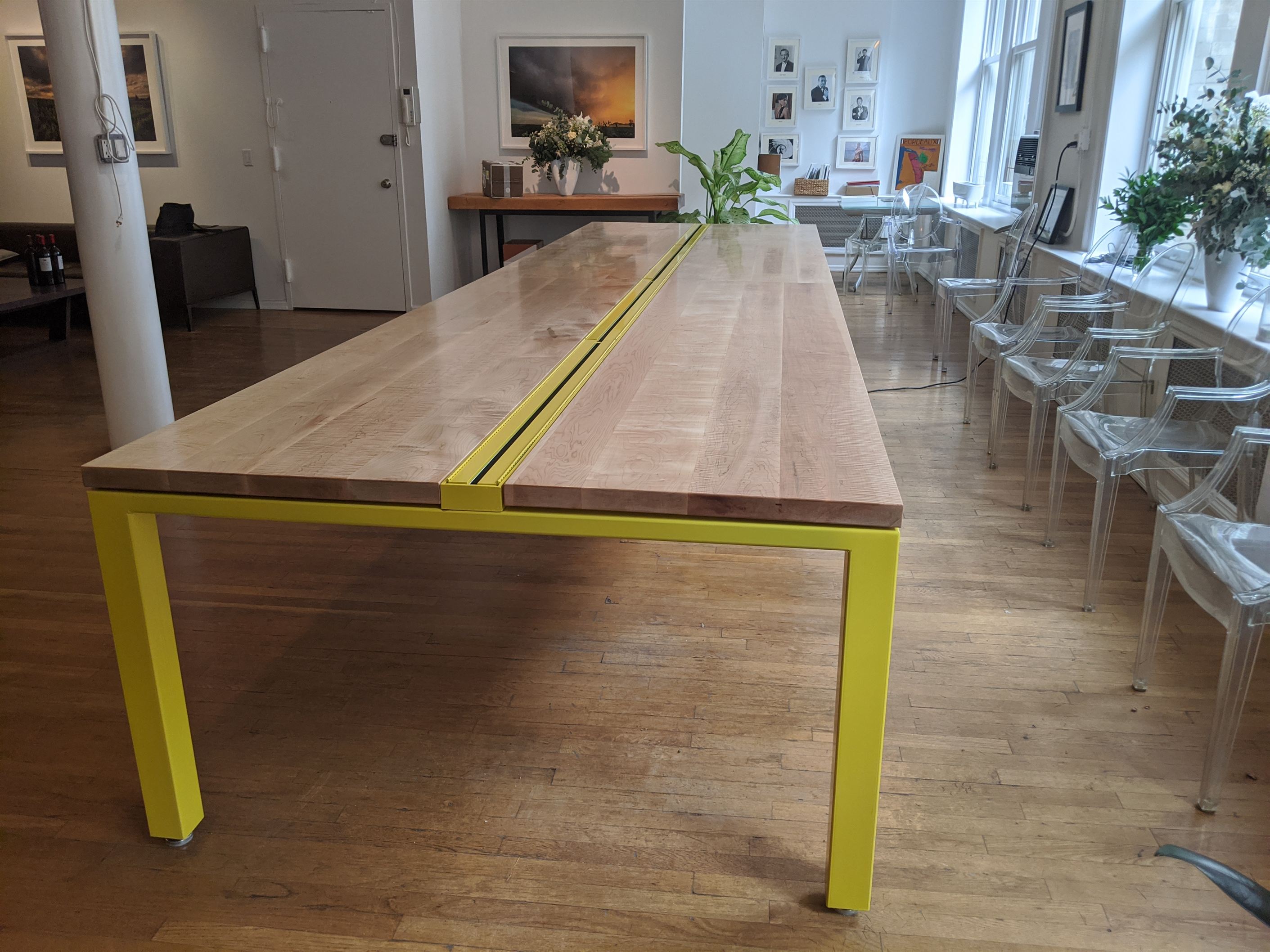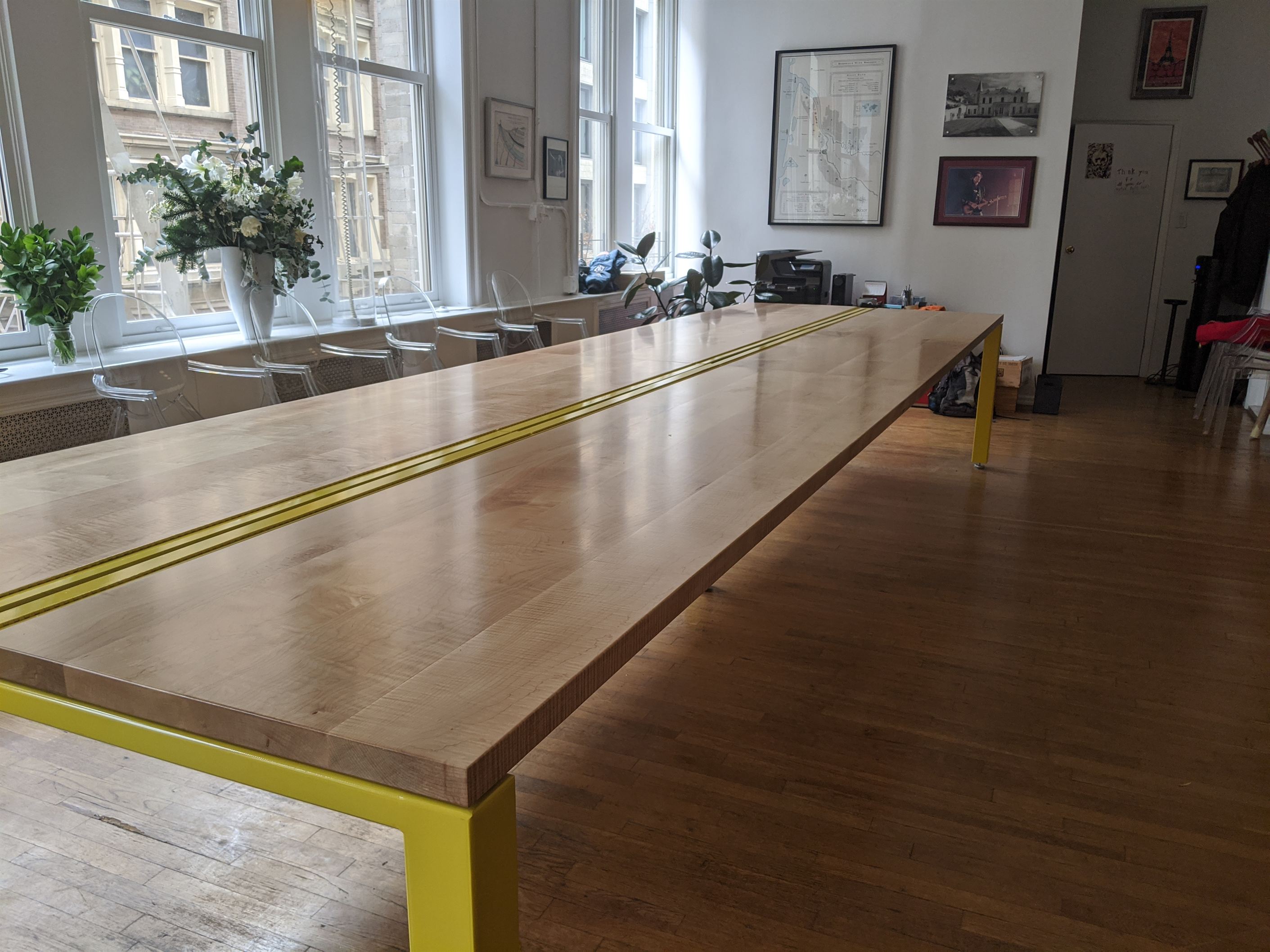 Gorgeous curly maple was put to good use on this 16ft conference table now proudly displayed in the Soho office of Duclot Wines NY. Solid lumber throughout with steel base and central channel for electrical hookups. Bright yellow auto paint and hard wax oil finish