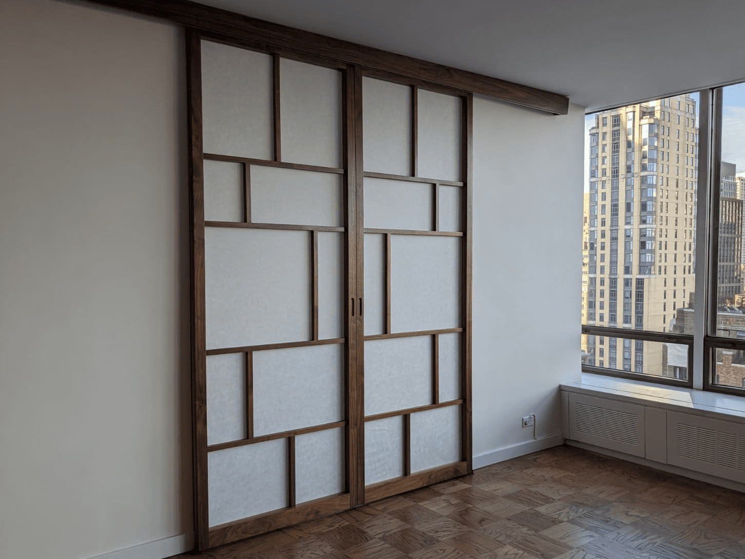 This multifunctional and unique piece serves as a murphy bed for house guests as well as a liquor cabinet and storage unit. The top half is entirely clad in luxurious walnut veneer and includes a custom built curved door for the liquor cabinet and shelves for glasses. The bottom half features a mix of maple, walnut and makore veneer inlays creating an original pattern design. The bed is mounted on hydraulic lifts for easy opening. The unit is finished with satin lacquer.