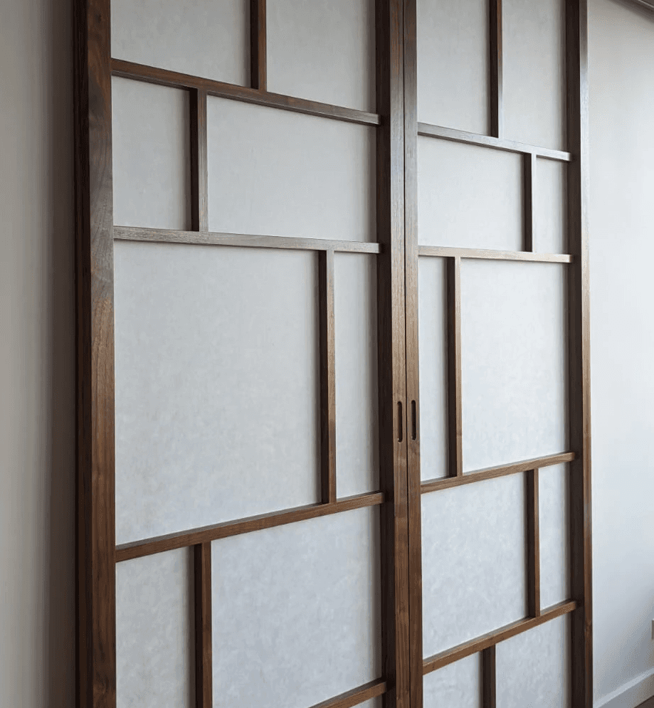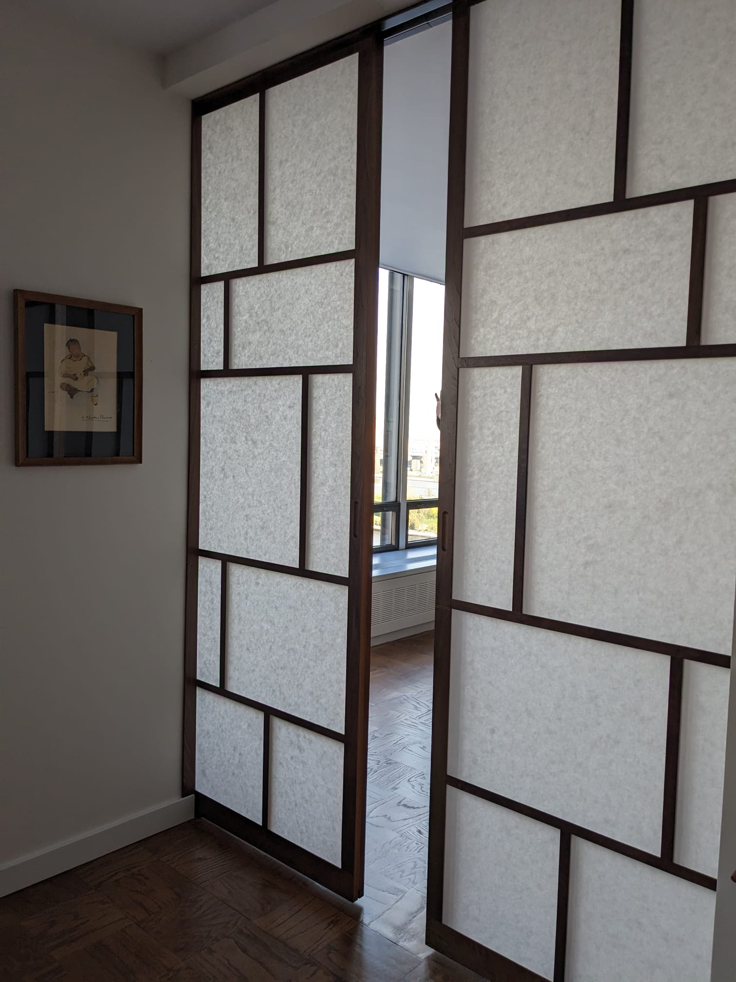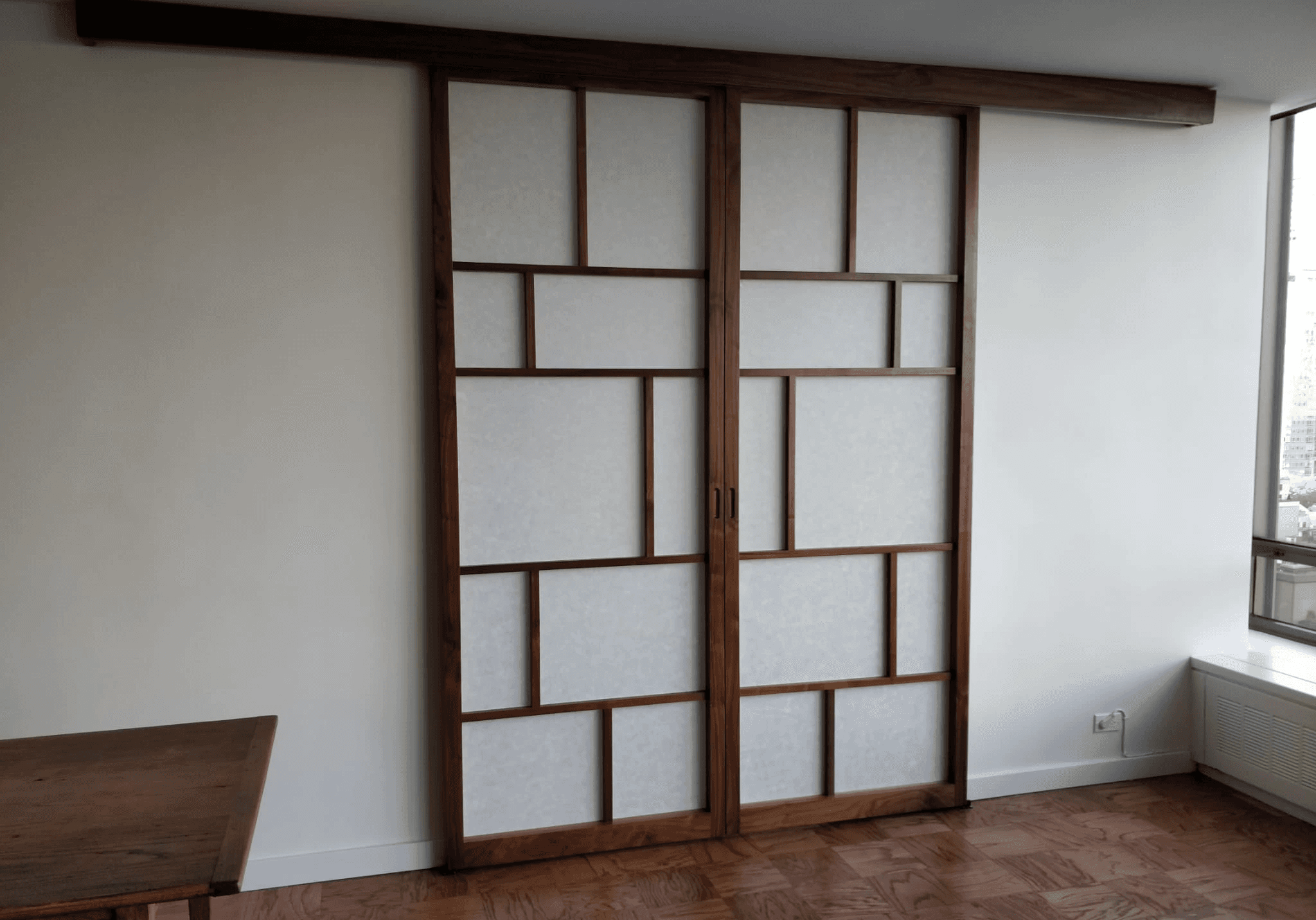 A clean and functional set of sliding doors built for a private residence in New York City. Inspired by traditional Japanese Shoji doors, the unit is made of solid walnut and rice paper with a satin lacquer finish, mounted on a custom wooden track with hidden caster support.