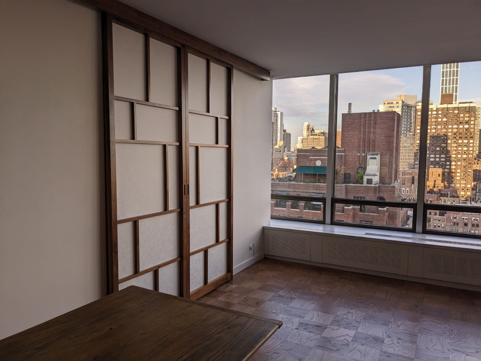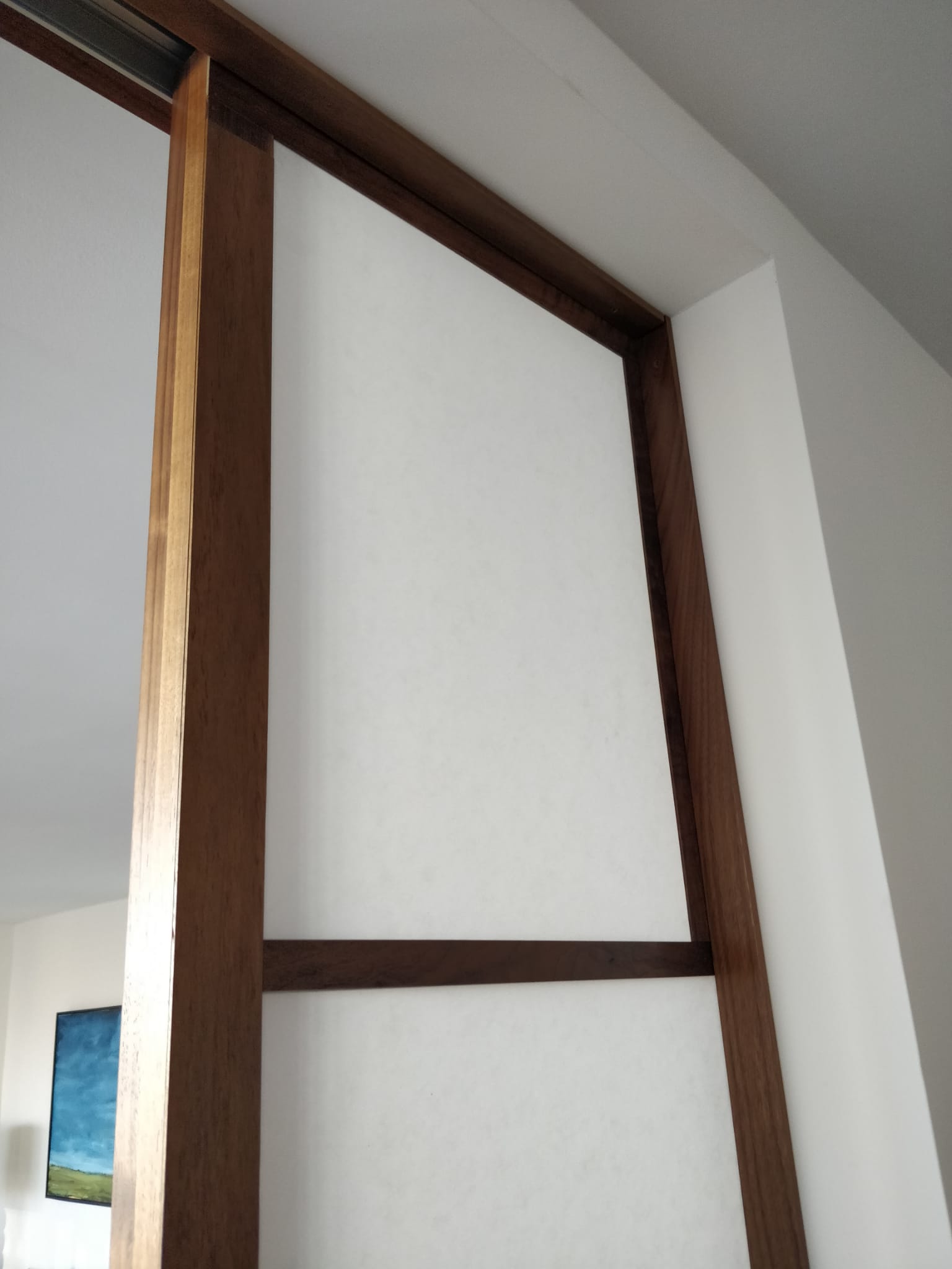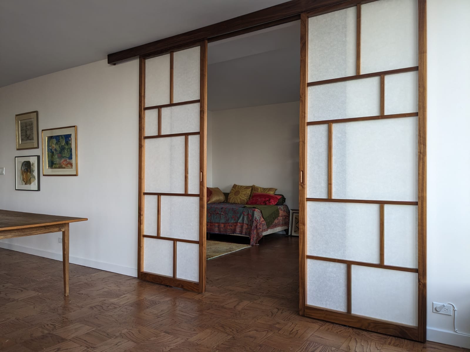 A clean and functional set of sliding doors built for a private residence in New York City. Inspired by traditional Japanese Shoji doors, the unit is made of solid walnut and rice paper with a satin lacquer finish, mounted on a custom wooden track with hidden caster support.